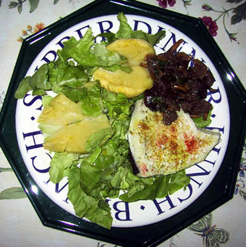 Faîtes tout cuire séparemment : l'espadon saupoudré d'épices au micro-ondes ; les chanterelles à la poêle avec le coriandre, le sel et le poivre; les patates au micro-onde. Disposez les feuilles de salade dans les assiettes, coupez les patates en deux, faire fondre le fromage dessus, rajouter l'espadon et les champignons et mangez vite pendant que c'est chaud. Et voilà, un repas complet dans une assiette.. |