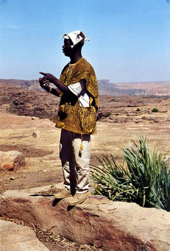 Notre guide dogon Noun avec son bonnet en forme de tête de poisson et 4 pointes.