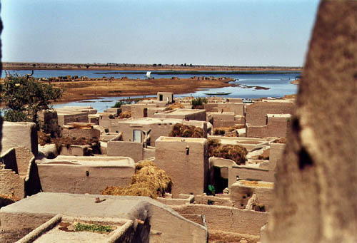 Village au bord du Niger. Saison sèche, basses eaux.