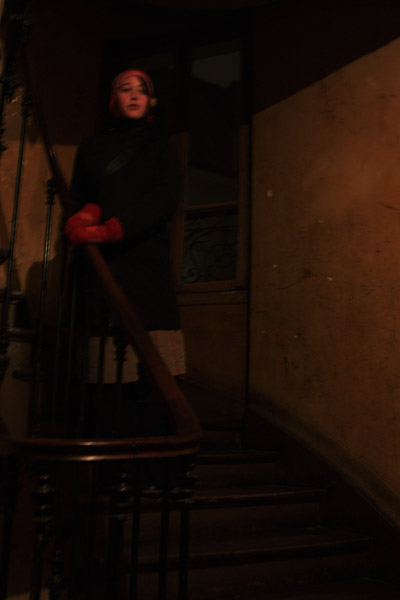 Marion la nuit dans un immeuble parisien.