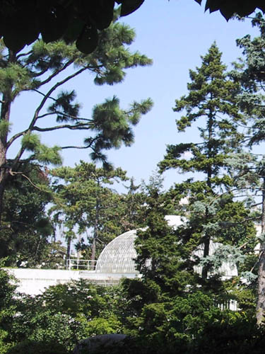 Août 2003, jardin japonais. Vue sur la serre du jardin français.