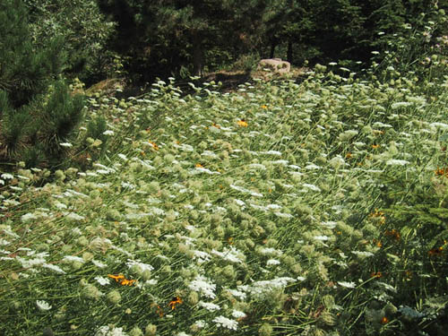 Août 2003, jardin vosgien. Traces de vent sur des fleurs couchées