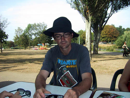Sur la terrasse du dernier bar glacier avant de quitter les espaces verts autour du plan d'eau, pour déboucher sur le stade. Essayage de chapeau.