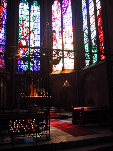 Vitraux modernes qui ne ressemblent pas à du Chagall. Contrairement à ceux de l'aile Nord, plus jolis d'ailleurs. mais pas de photos, à voir avec les yeux.