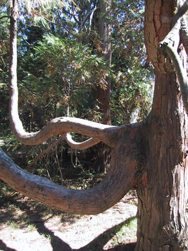Une espèce de cyprès tout désarticulé me barre la route. Ce n'est pas son écorce rugueuse qui m'arrêtera. (septembre 2003)