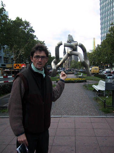 L'église au fond, derrière la sculpture en forme de boudin blanc.