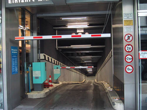 Entrée du parking des Galeries Lafayettes. Sûrement très marrant à faire en luge l'hiver.