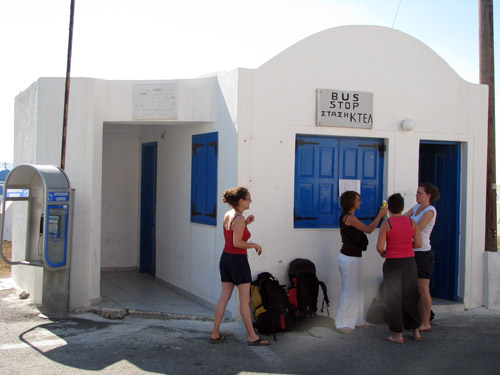 4 août 2007, Santorin, Akrotiri. Attente du bus pour Fira.