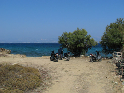 5 août 2007, Paros. Nos scooters sur la plage de Messada