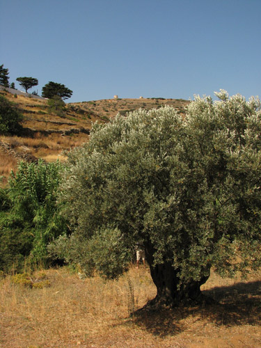 6 août 2007, Paros, Lefkes. Sur l'ancienne route bizantine. Adrien derrière un olivier centenaire.