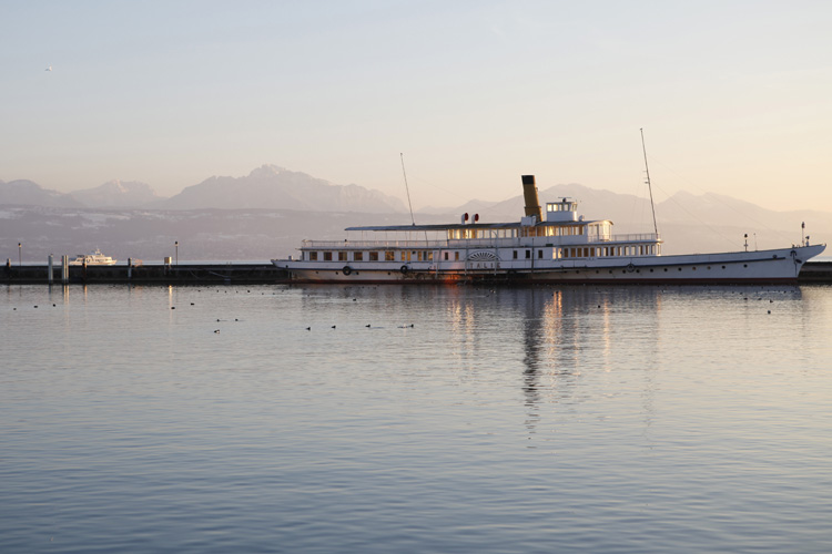 Mots-clés bateau • couchant • glace • lac • montagne • oiseau • port